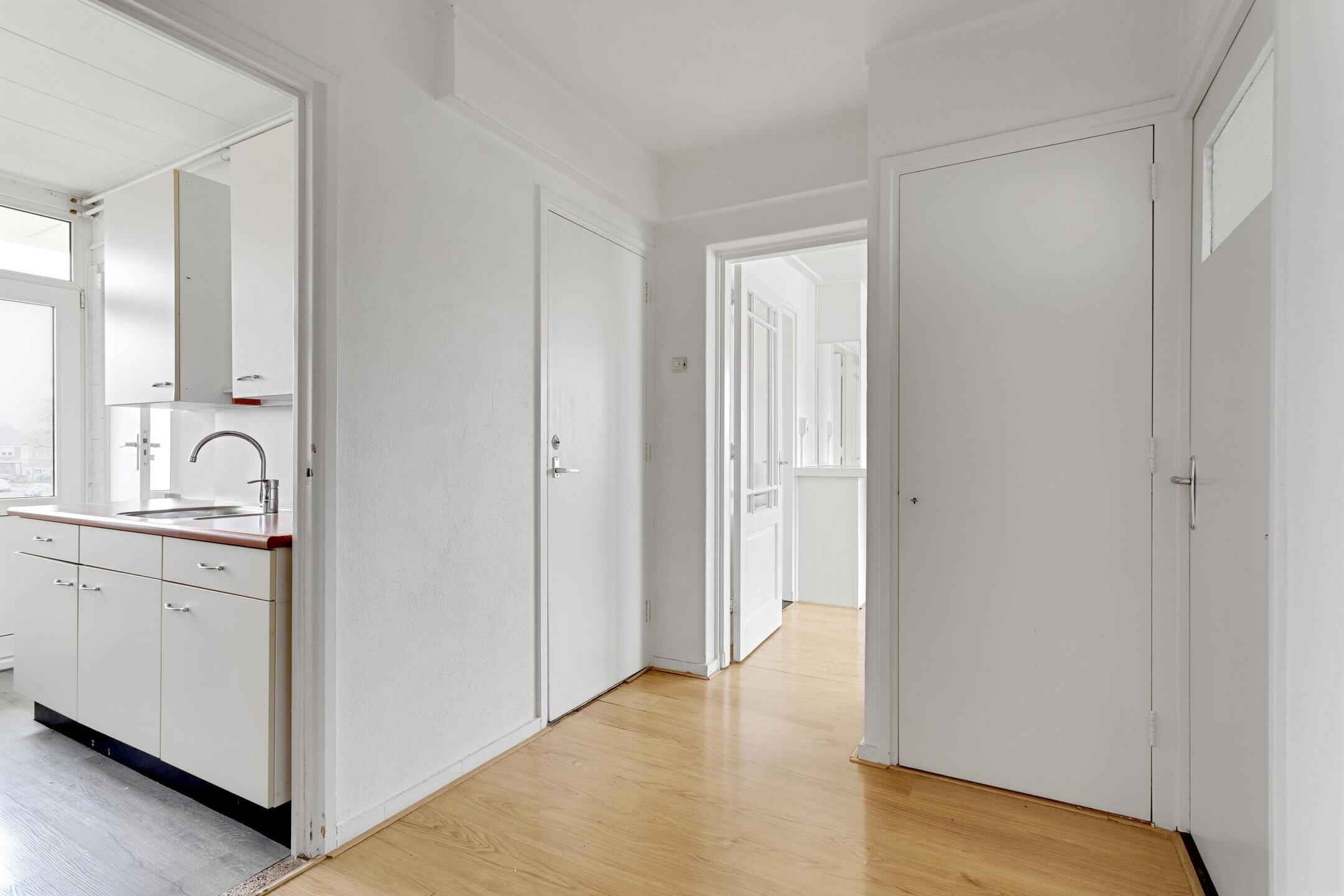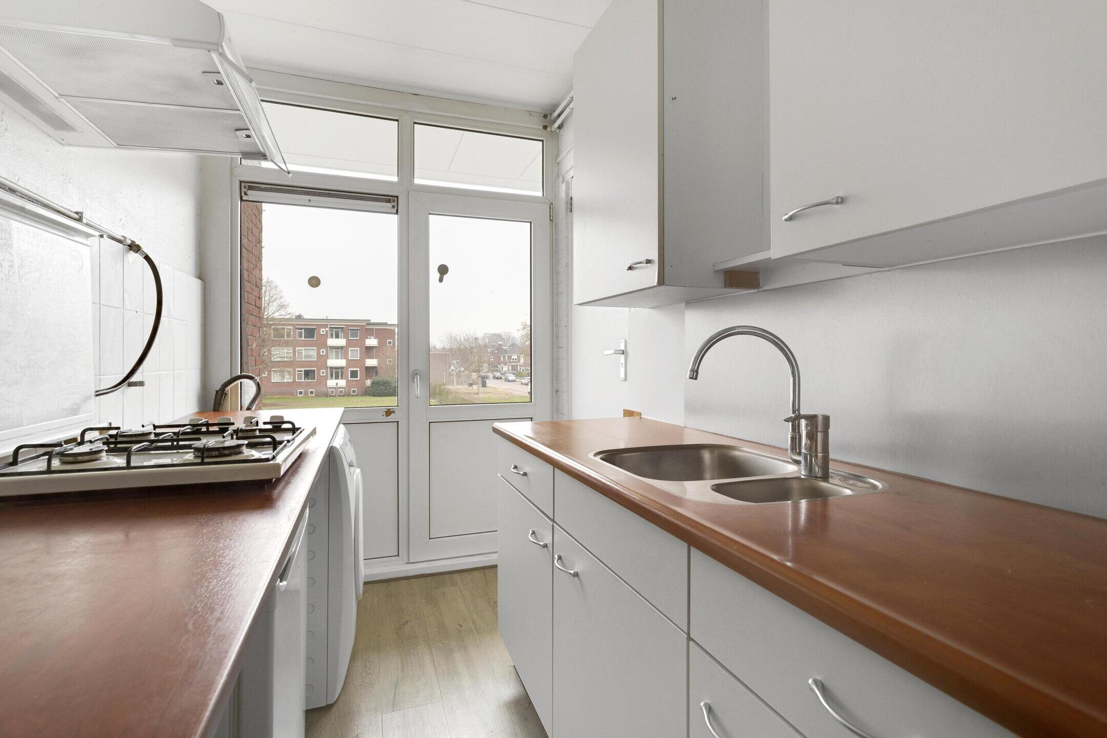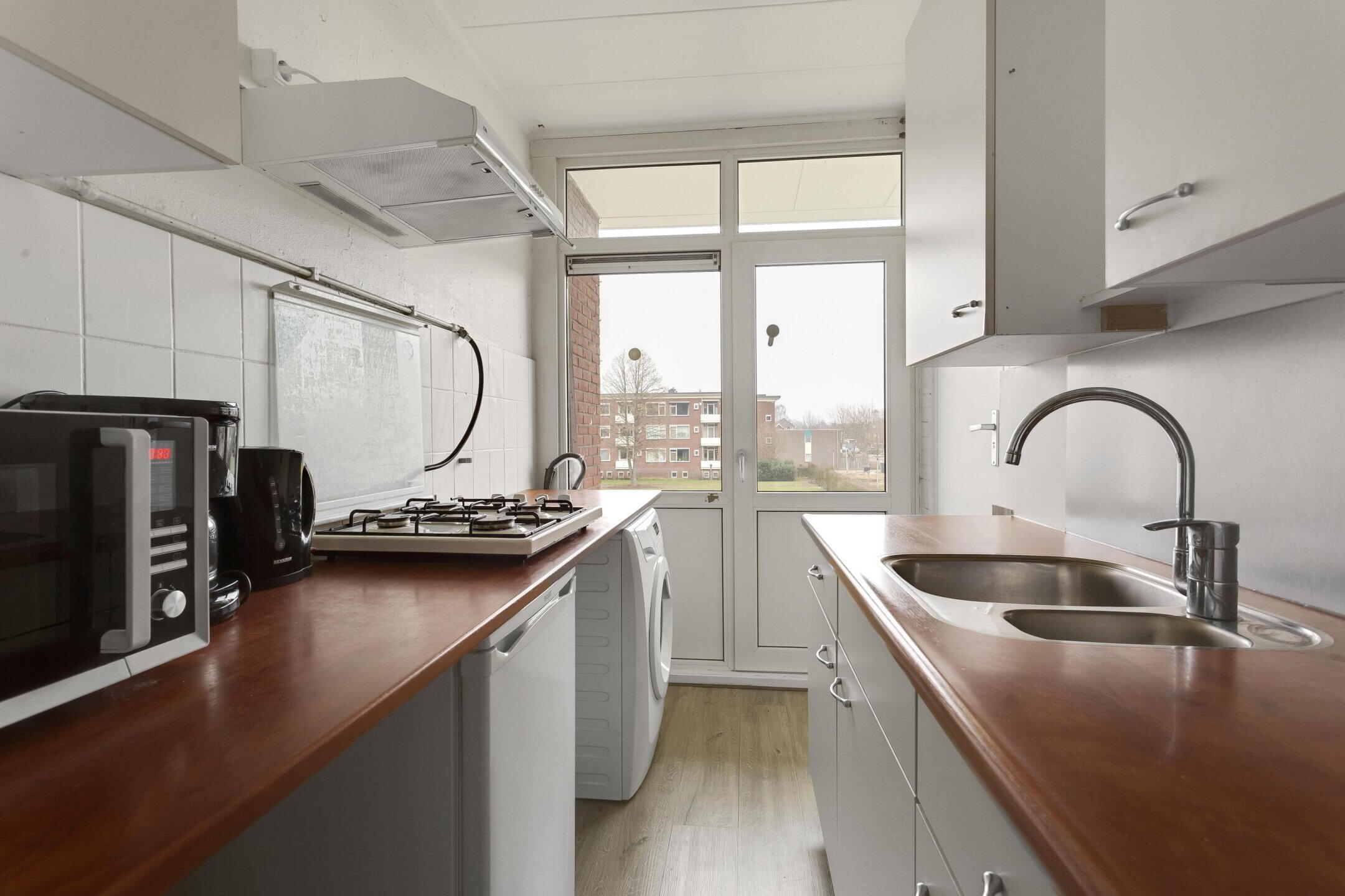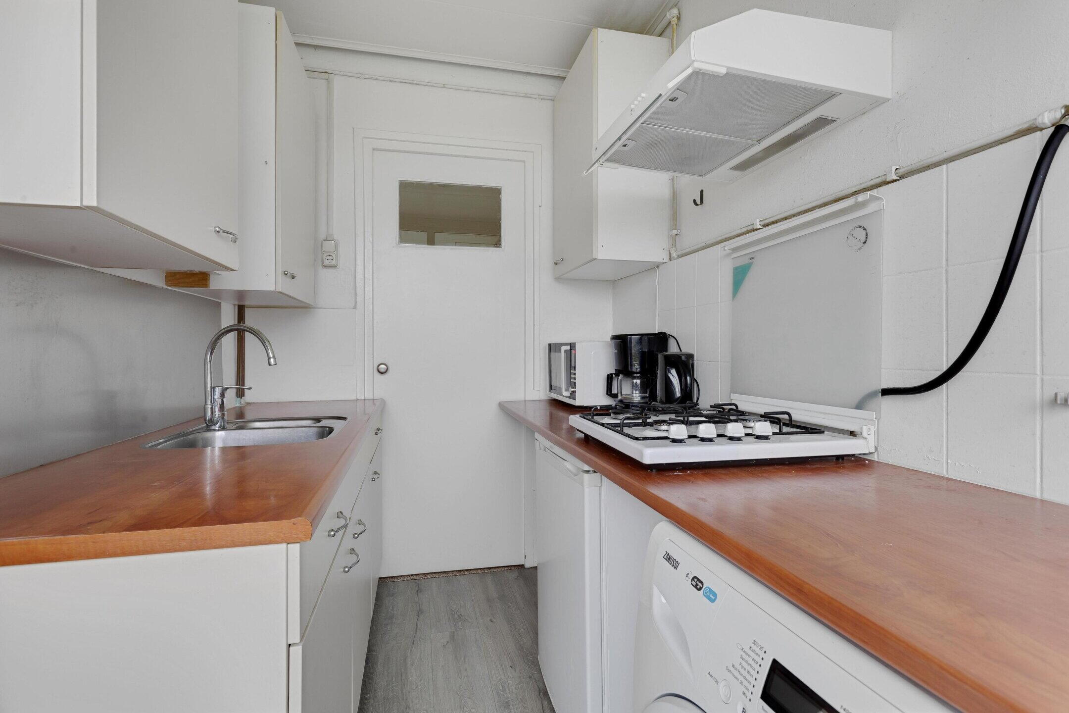 De entree geeft toegang tot de centrale hal met meterkast en toiletruimte. De slaapkamer aan de voorzijde is voorzien van een vaste kast en biedt toegang tot het balkon. De perfecte plek voor je ochtendkoffie. De keukenruimte is functioneel ingericht, heeft eveneens toegang tot een balkon en kijkt vrij weg. Koken met dit vrije uitzicht zorgt voor een gevoel van ruimte en rust en zal nooit vervelen. Vanuit de keuken bereik je de badkamer, voorzien van een douche, wastafel en aansluiting voor de wasmachine. Zowel de keuken als badkamer kunnen naar eigen wens worden gemoderniseerd.